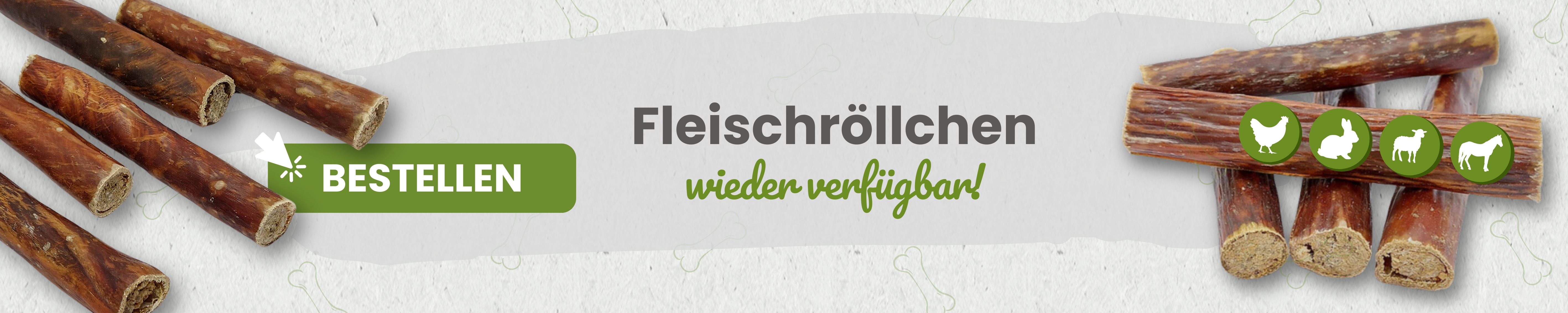 Unsere Fleischröllchen für Hunde setzen sich aus Rinderschlund, Reis, Rindfleisch und einer Fleischsorte nach Wahl (Huhn, Kaninchen, Lamm oder Pferd) zusammen.